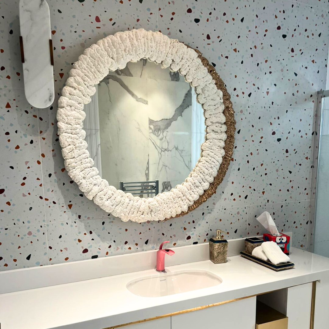 Upgrade your space with this bold, two-layered puffy mirror! Its foamy texture and golden background provide a glamorous look that will draw the eye. Add a touch of daring to your décor and challenge the status quo!